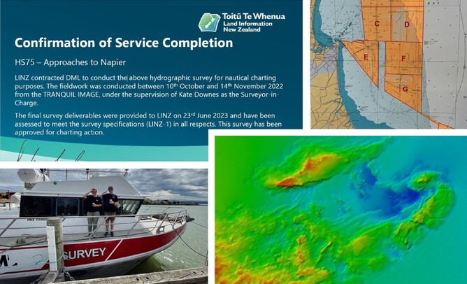 DML recently delivered The Approaches to Napier Hydrographic Survey (HS75) to Toitū Te Whenua Land Information New Zealand (LINZ). Kate Downes, Surveyor In Charge (SIC) delivered 8 Tb of data which included raw data, bathymetric surfaces, water column data, backscatter imagery and numerous reports. The data will be used to update nautical charting products in the region.