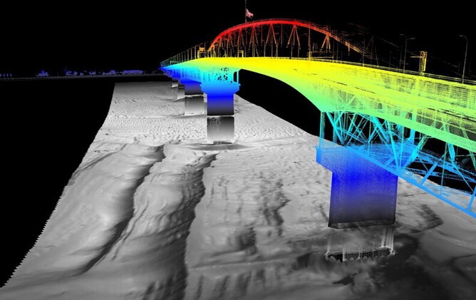 Using our dedicated hydrographic survey vessel and an integrated mobile laser scanning system, we scanned the super structure and bridge piers. We were also tasked with gathering data from submerged surfaces below the bridge. We were able to simultaneously collect this data using a Multi-Beam Echo Sounder mounted to the side of the vessel. Sophisticated on-board systems allowed us to visualize data being captured in real-time from both above and below the waterline.