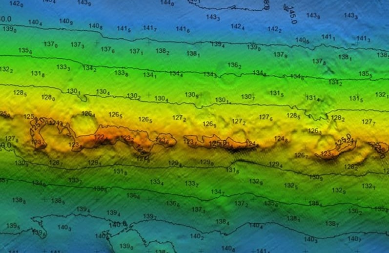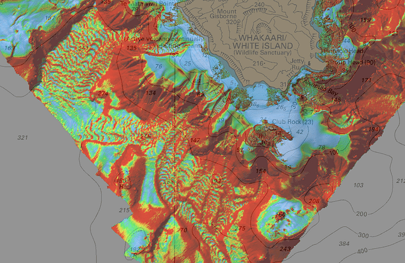 The survey's back scatter and bathymetry data uncovered extensive lava flows, a complex inter-tidal reef structure and submerged cliffs and underwater canyons. Importantly, a previously uncharted pinnacle was identified outside the 50 metre depth contour at a depth of 3.3 metres.